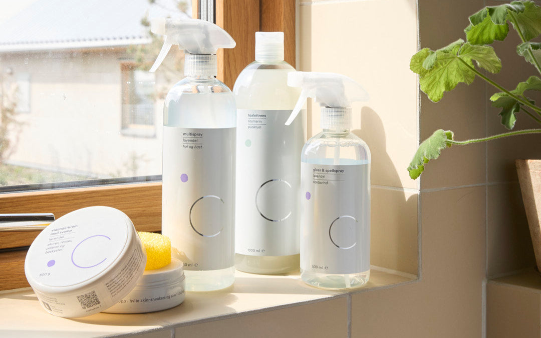 Fem flasker med husvask fra Csoaps vvbildet mot et hvitt håndkle.