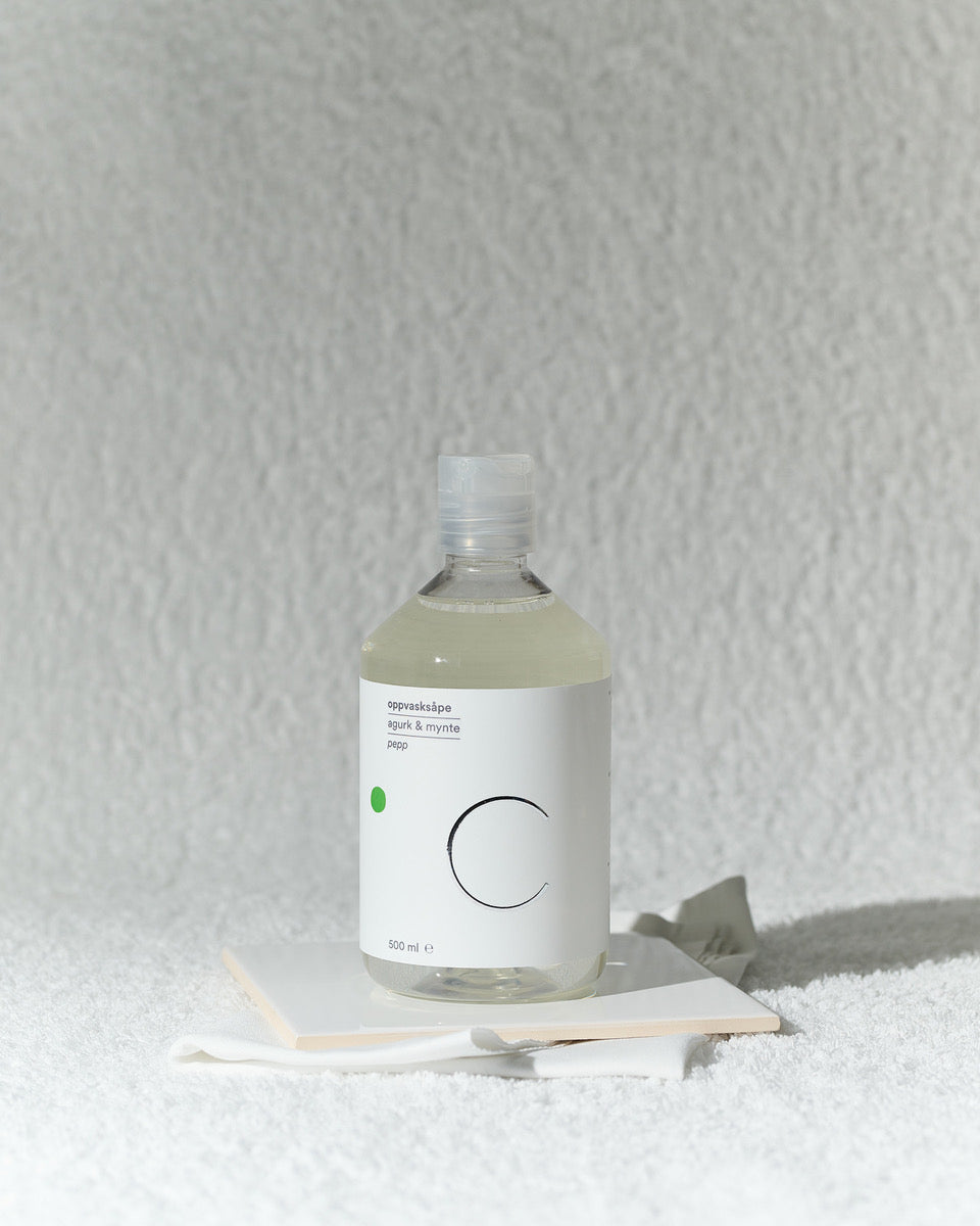 Flytende oppvasksåpe fra Csoaps i duften snø foran hvitt håndkle.